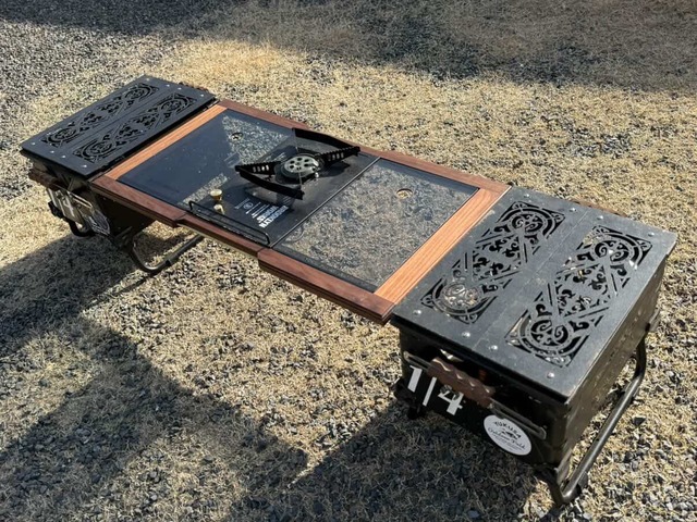 シェルコンを連結させ、機能性を最大化させるシェルコンブリッジテーブル。 無骨なシェルコンに「木の温もり」と「高級感」をプラスします。 自由自在なレイアウトを可能にするIGT規格への対応。フラットバーナーなどのユニットをシームレスに組み込み、調理から食事までをこの一台で完結させます。 シェルコン2台を繋ぐだけで、キャンプサイトの中核を担う、堅牢かつ美しいメインテーブルが完成します。 フレームのサイズ 約75cm×45cm 他にも、 2ユニット 2.5ユニット 3ユニット それぞれソロ用(片側真鍮パイプ入り) デュオ用(両側真鍮パイプ入り)タイプ がございます。 ※ブリッジテーブルのみの販売です シェルコン、天板等は付属しません。 ※画像はデュオ用(両側真鍮パイプ入り)になります。