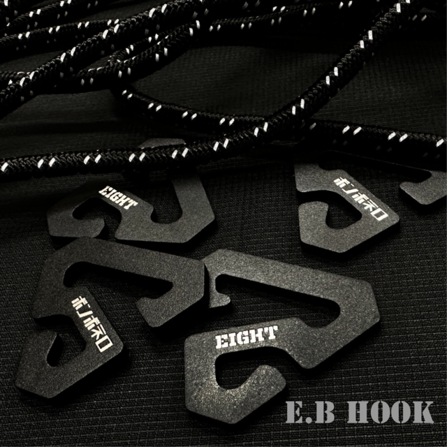 商品名 : E.B Hook spec ・カラー : ブラック ・JAN code : 4582528362182 ・メーカー :(株)Eight ・重量 : 約1Kg ・収納サイズ : 120x120mm ・素材 : stainless steel (sus304) 3T 商品説明 強度と錆びにくさが特長の強化ステンレス(sus304)を採用したフックです。 タープのカラビナの代わり、またストリングに引っかけてフックとしても 使用可能なデザインに仕上げました。 使用用途は様々です。