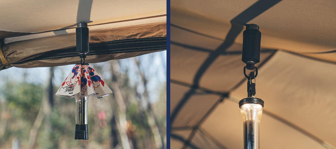 ランタンハンガー&ガイロープ対応:小型ランタンハンガーやガイロープに取り付けられ、マグネット部分にはワンタッチでLEDランタンを装着できます。