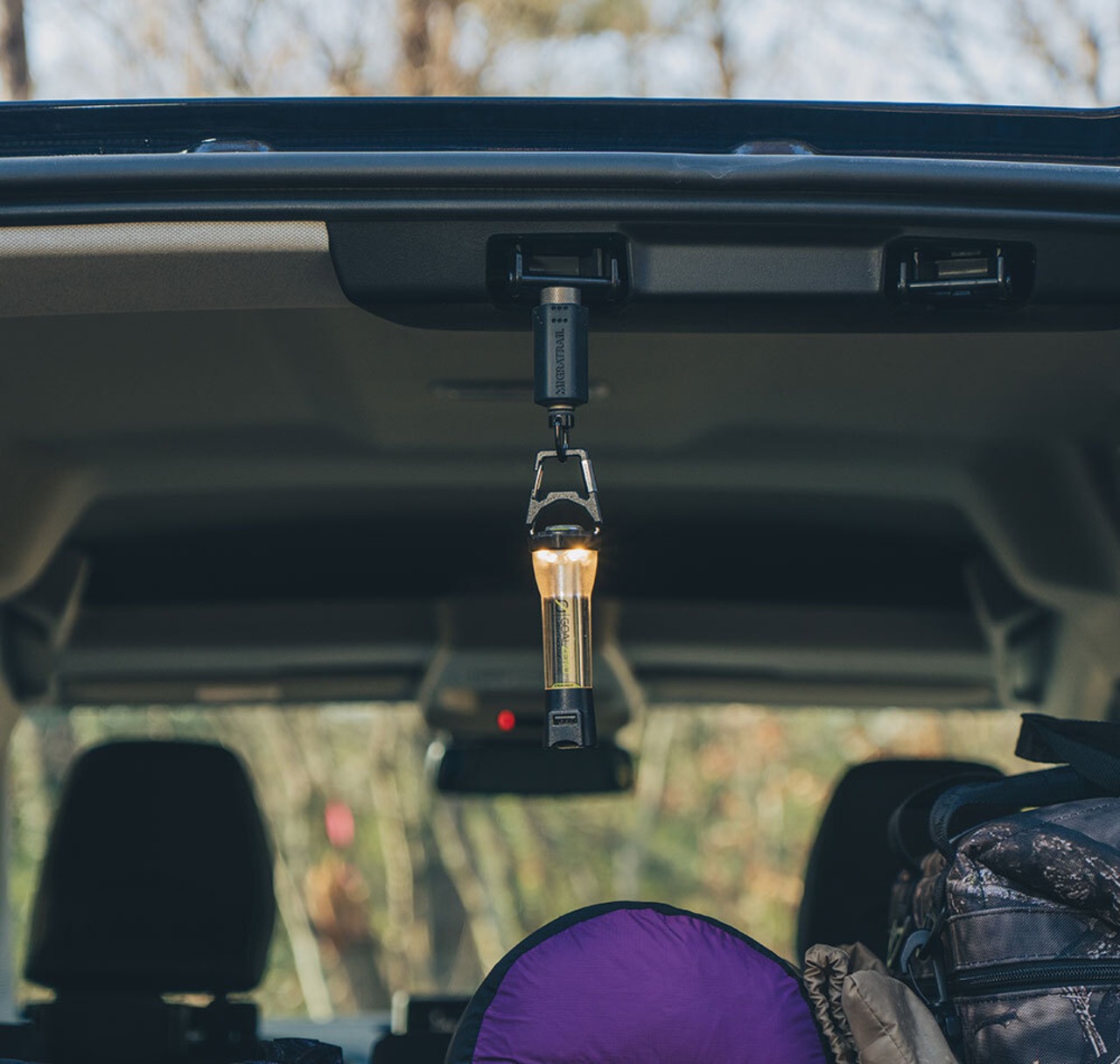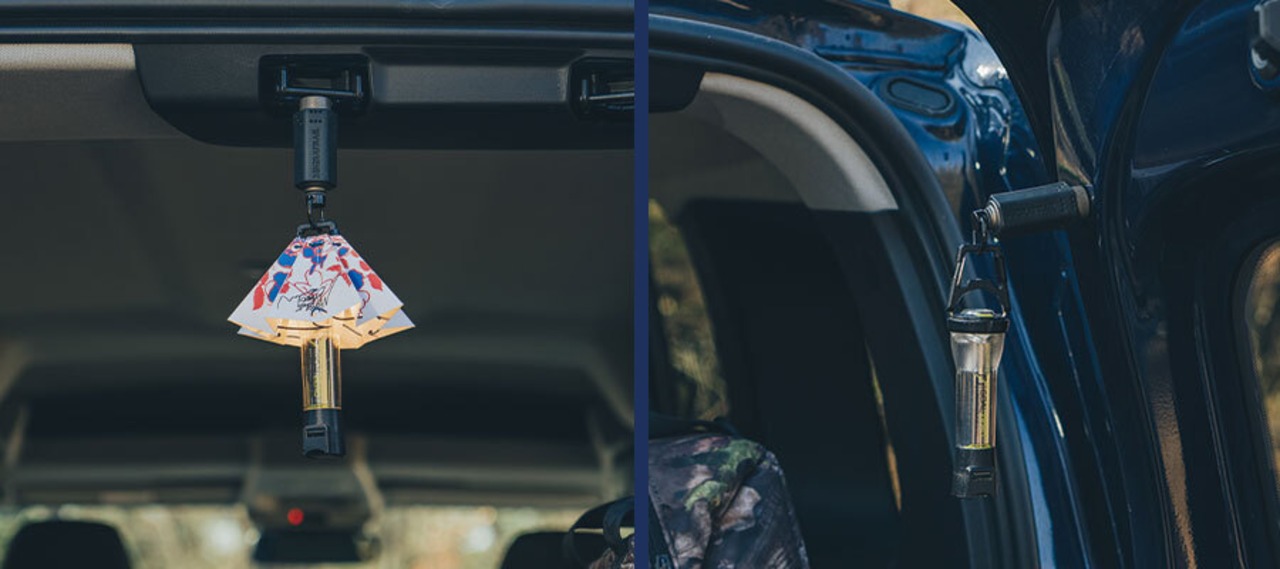 LEDランタンや小物の吊り下げ:バックドア付近や車のボディに装着可能。
