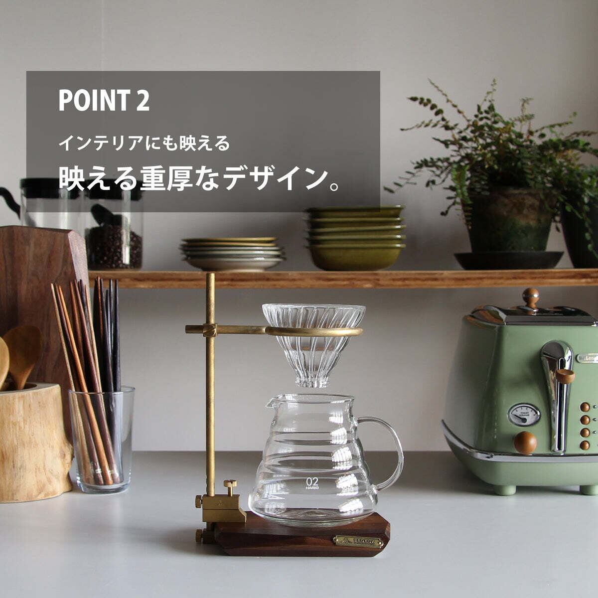 ドリッパーを装着する真鍮製のリング部は、 上下、前後に可動することができるので、 サーバーはもちろん背の高いピッチャーや マグカップ、グラスなど様々な大きさ、 高さに対応することができます。