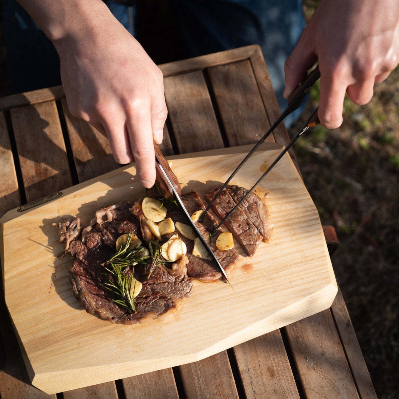 どの方向に置いても先端がテーブルにつかず、非常に衛生的なのでキャンプやアウトドアクッキング、ご自宅での焼肉など、色々なシーンで使用できます。
