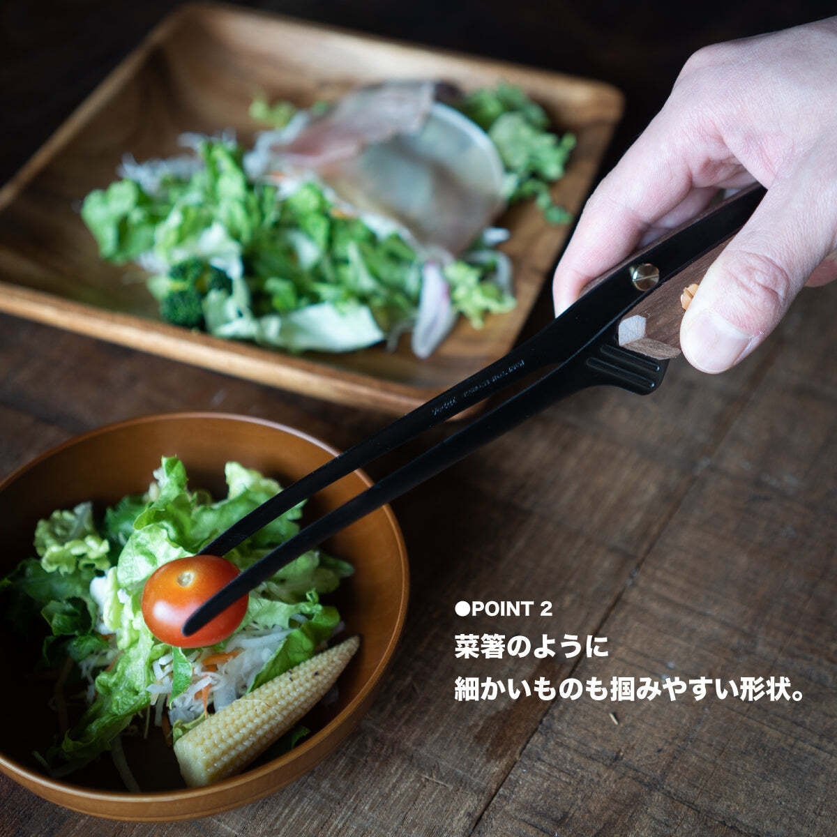 また、お箸の様に持って使用することもできるので、和洋折衷あらゆる料理の盛り付けや取り分け用のトングとしてお使いいただけます。