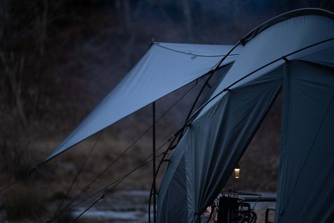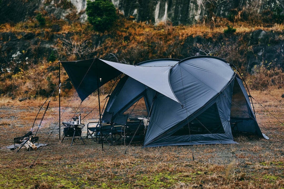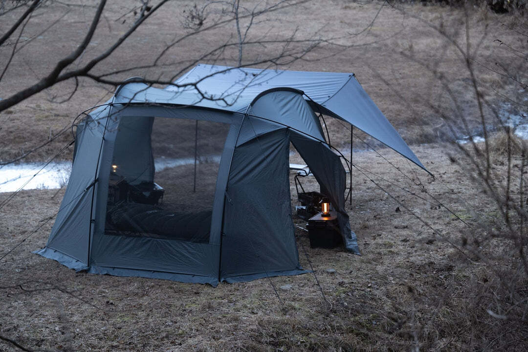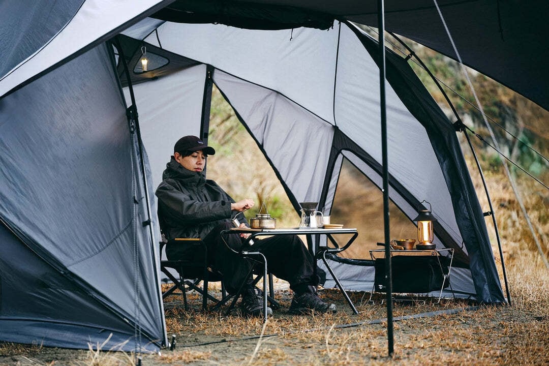 リビングと寝室の広さを確保し、焚き火を身近に楽しめるTC素材の跳ね上げパネルを搭載。さらに、跳ね上げたままでもフルクローズ可能な二重構造で、急な天候変化にも安心です。独自の3本フレームワークにより、広さと軽量性を両立し、自由に配置した道具とともに快適なキャンプを楽しめます。