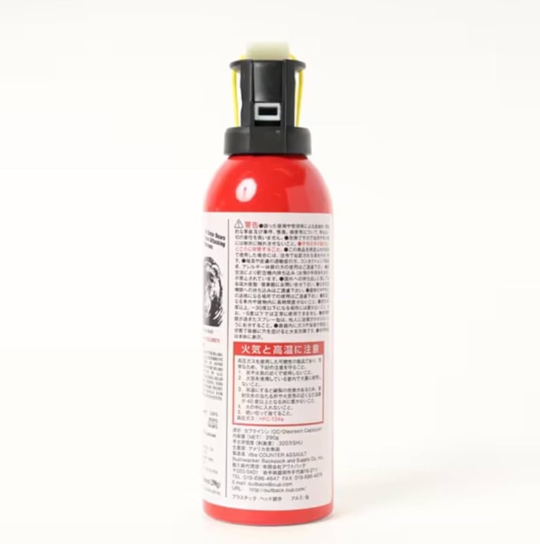 自然の中で熊や野犬に遭遇し、襲われそうになったときに使うアメリカ製のクマスプレー。レバーを押すと圧縮された唐辛子エキスが勢いよく約9.6m(※)、約7秒間(※)噴射し、その強力な刺激で熊を撃退できます。グリズリーの生息地として有名なアメリカのモンタナ州で研究、開発されている北米ではポピュラーな熊よけアイテムです。※無風状態の室内で行なわれた実験に基づくデータです。