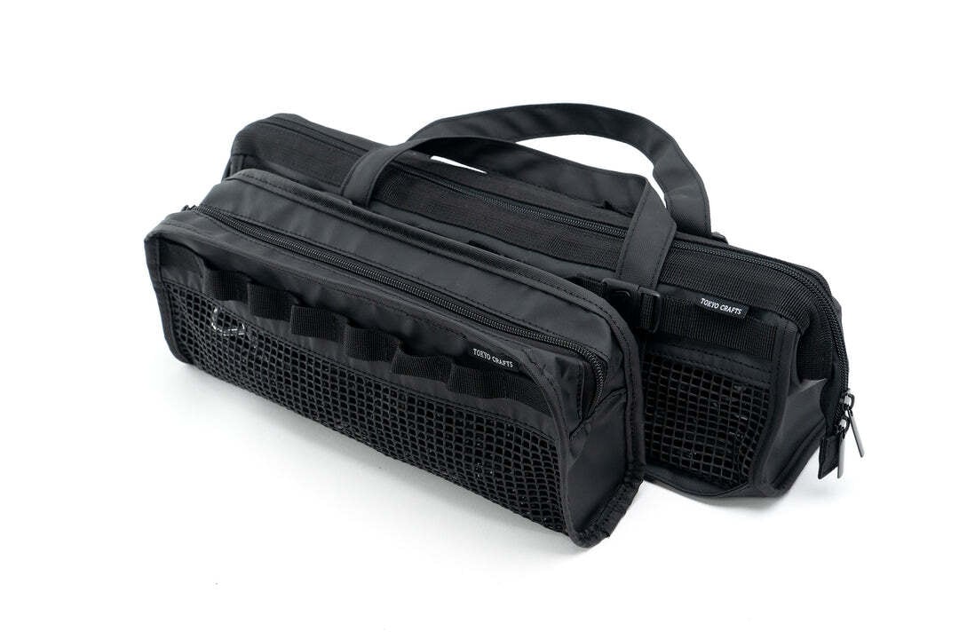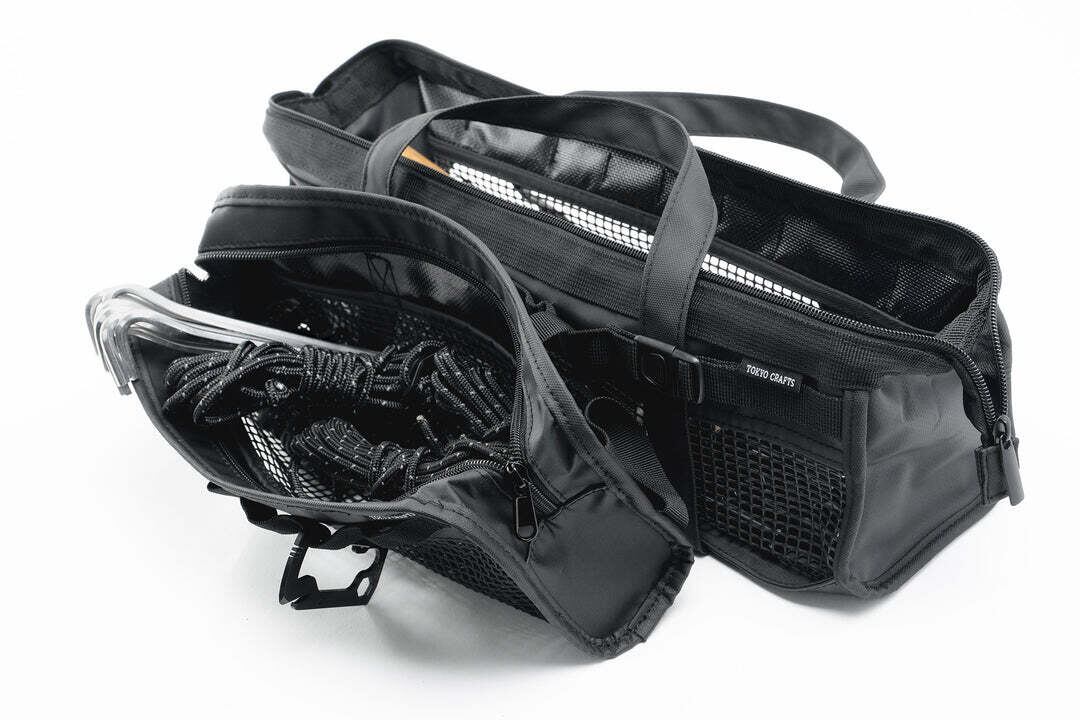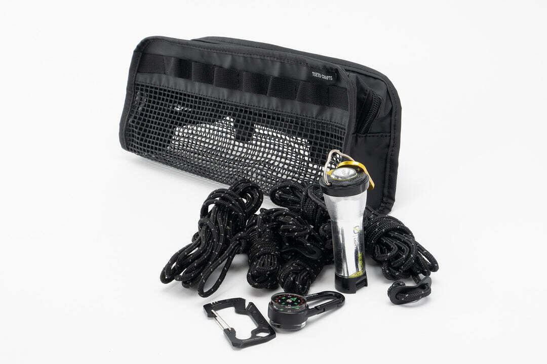 カトラリー、ファイヤースターター、モバイルバッテリーなどキャンプ小物をまとめて整理可能。テントサイトでは吊り下げてツールポーチに、撤収後はバックパック内の仕分けバッグとしても活躍し、ひとつで複数シーンに対応します。