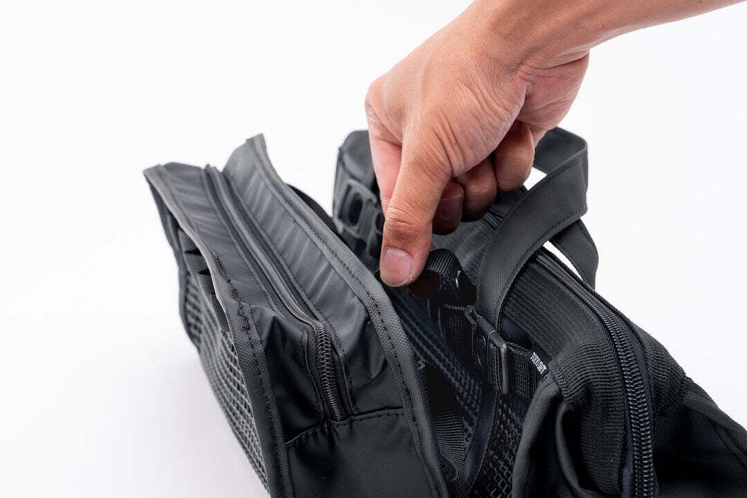 発売以来、ご好評いただいているエアドライ ペグケースには「濡れたままでも持ち帰りやすい」「中身が見えて忘れ物が減る」といったメリットがある一方で、「ロープやペグ以外の小物も同じ仕組みでまとめたい」というリクエストが数多く寄せられました。そこで私たちは、ペグケースに外付けできるポーチを開発いたしました。雨天設営後に濡れたロープを収納し、そのまま車内へ持ち帰っても乾燥させやすい。視認性の高さで忘失トラブルも減少し、フィールドでのストレスを減らせるポーチが完成しました。