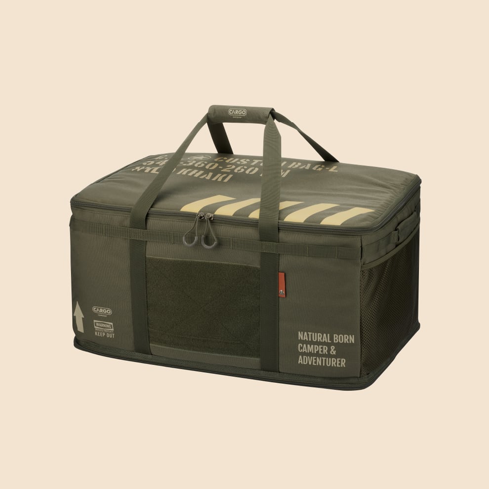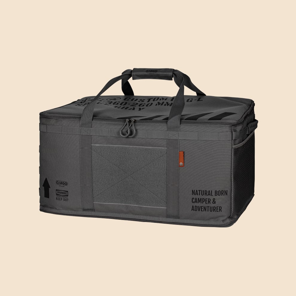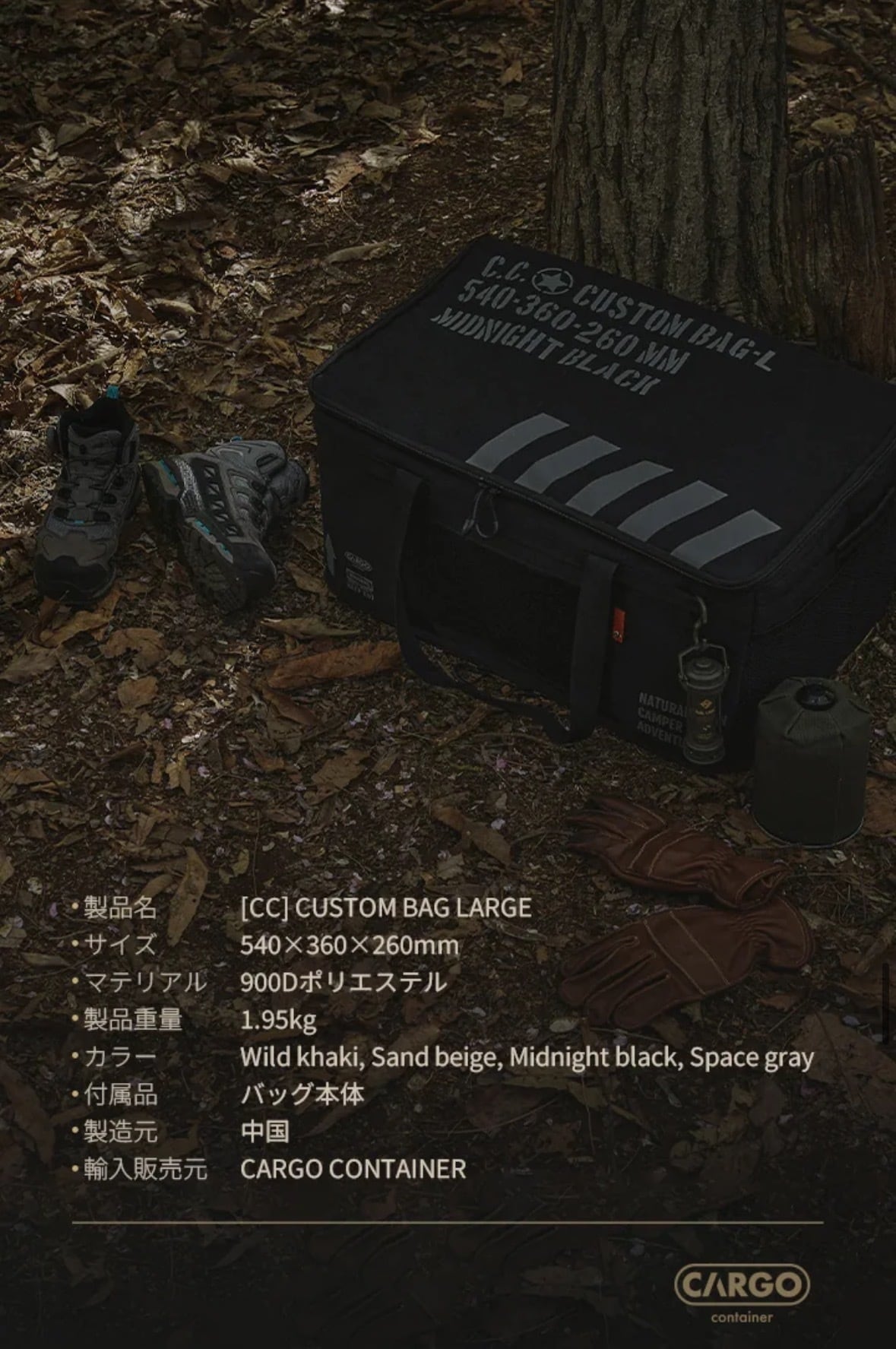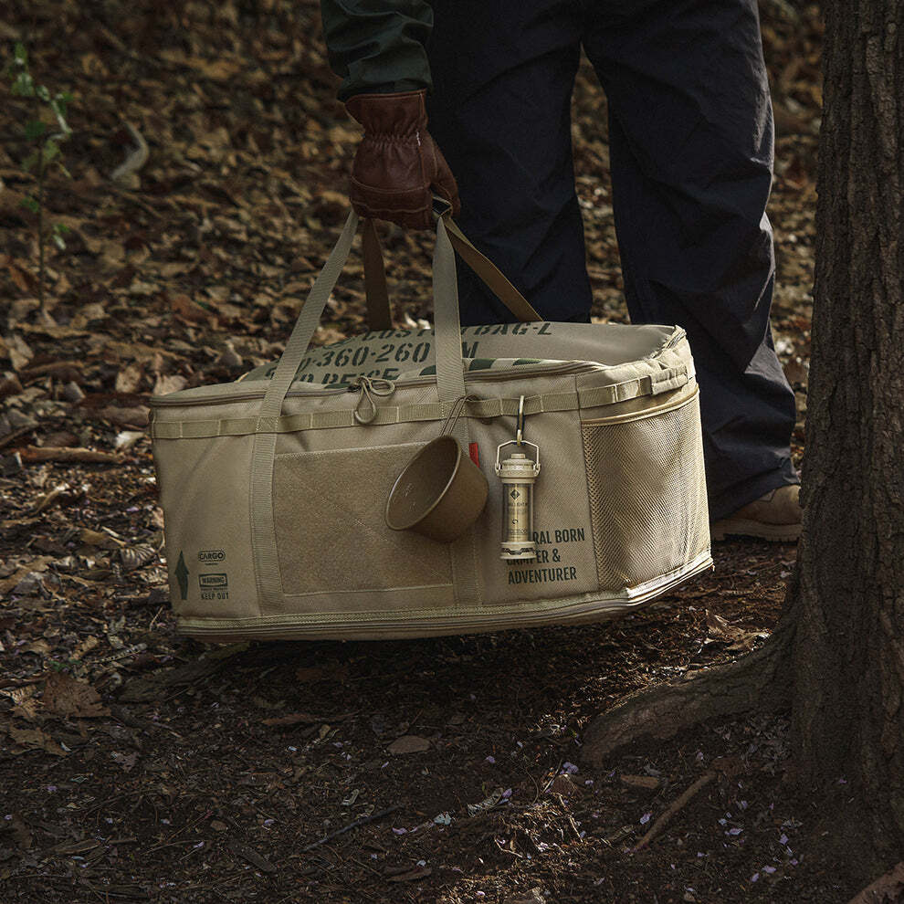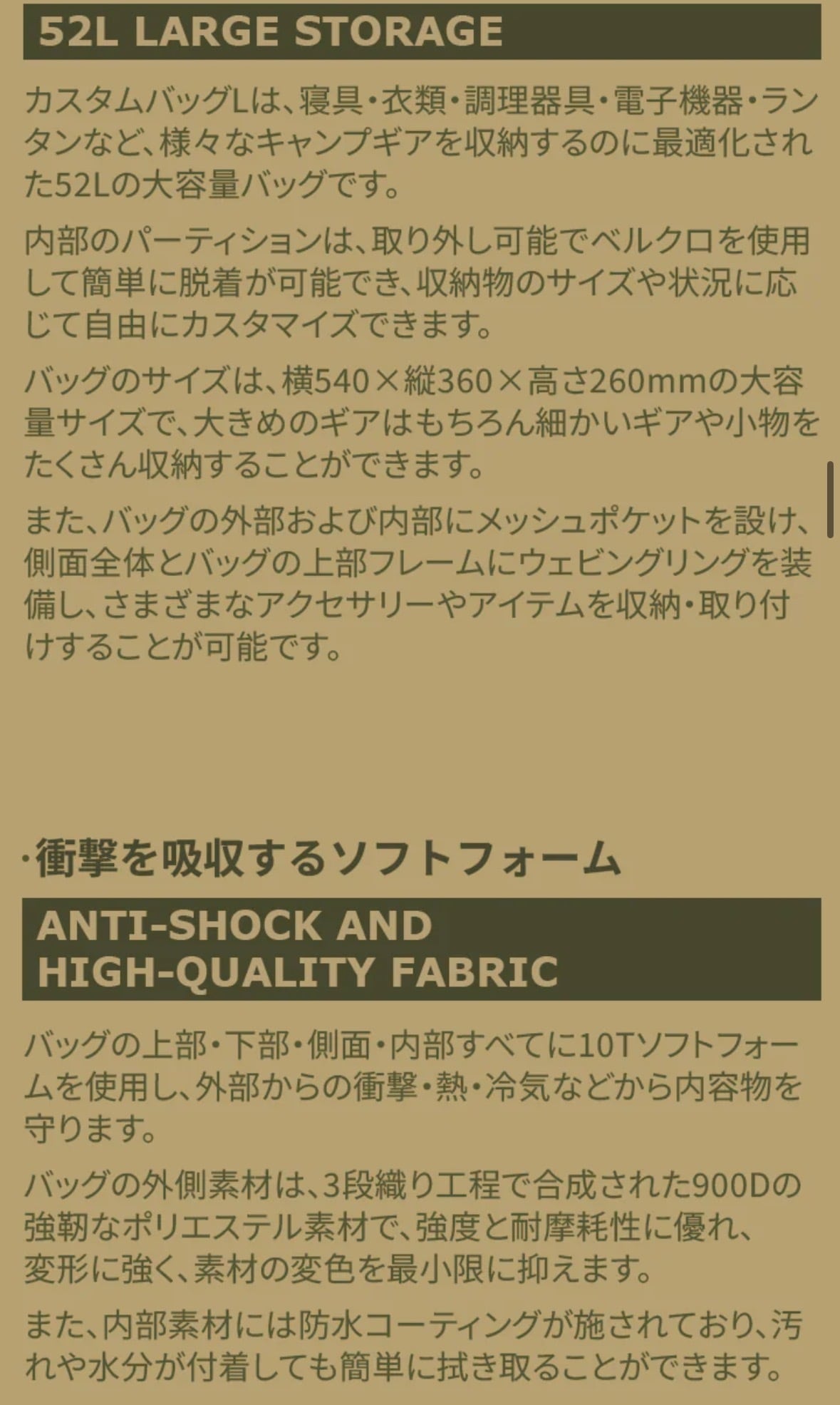 カスタムバッグLは、寝袋・ 調理器具・チェア・ランタンなど様々なキャンプギアや小物を収納するのに最適化された52Lの大容量ストレージバッグです。