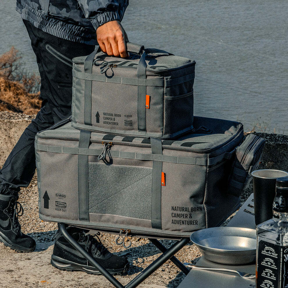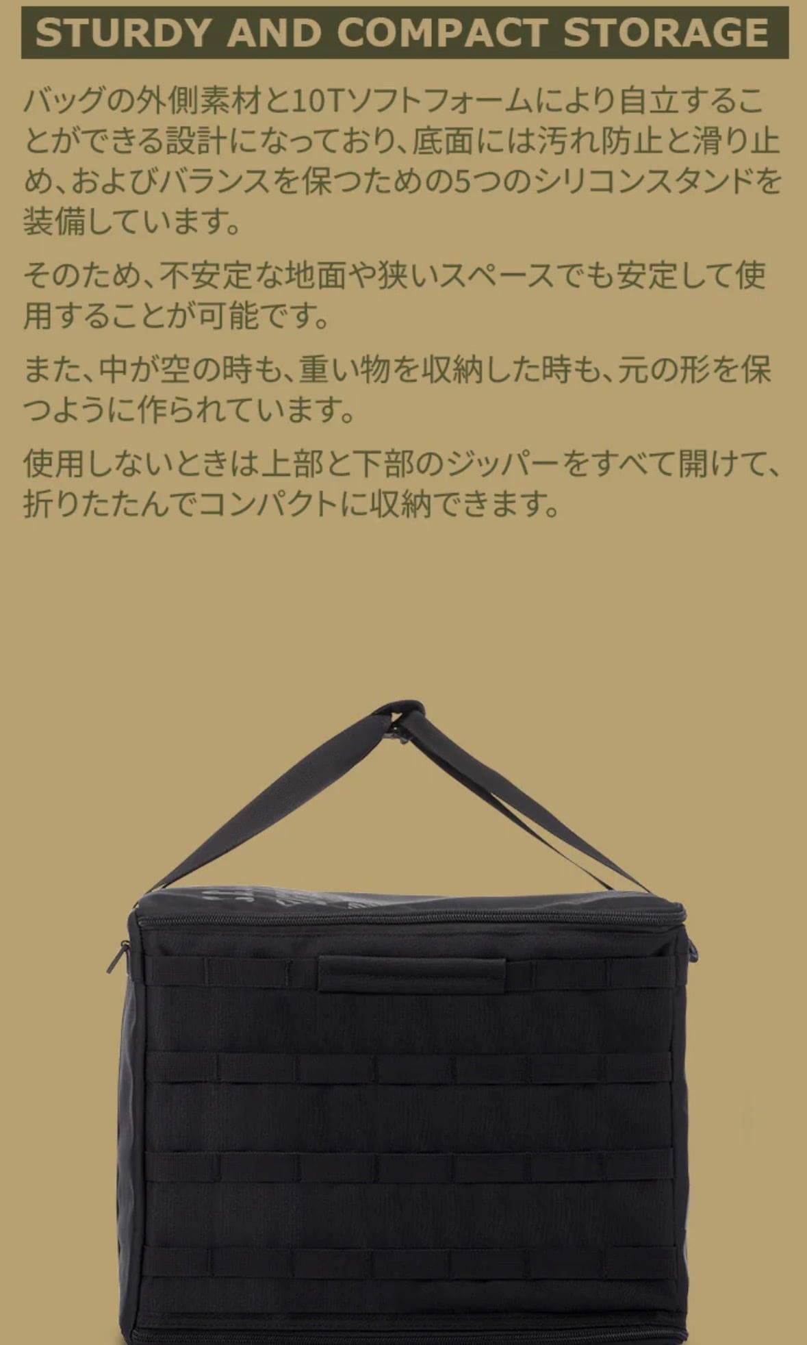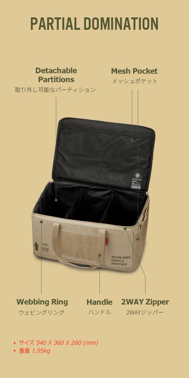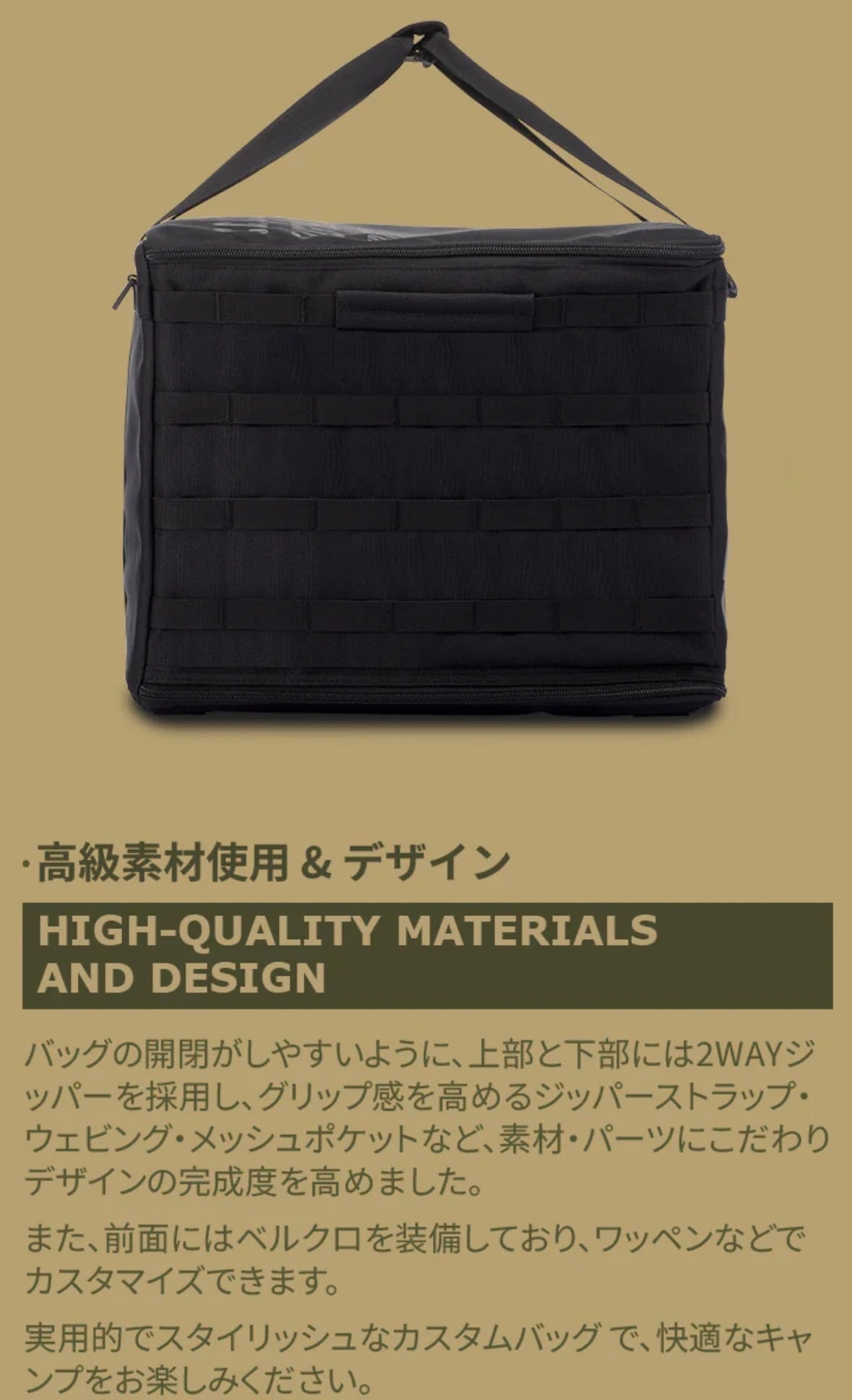 カスタムバッグLは、寝袋・ 調理器具・チェア・ランタンなど様々なキャンプギアや小物を収納するのに最適化された52Lの大容量ストレージバッグです。