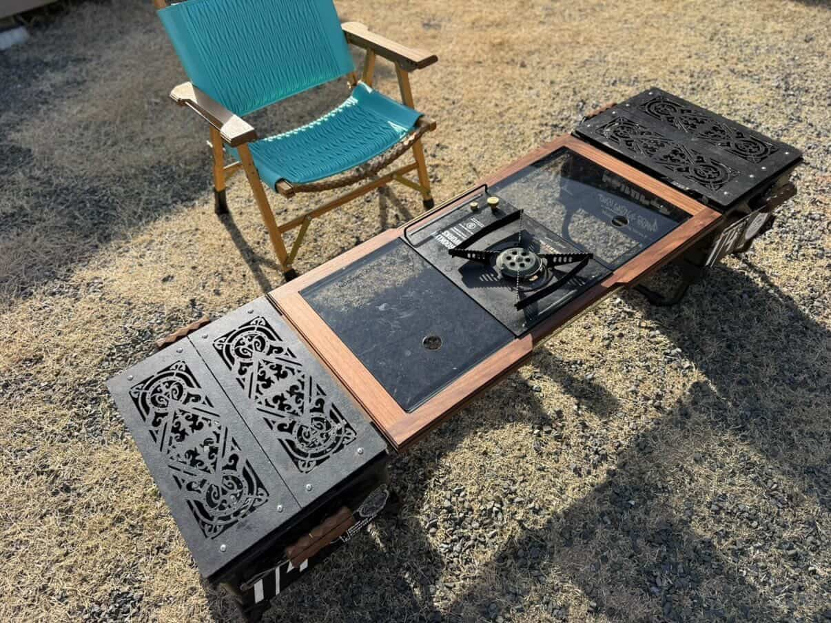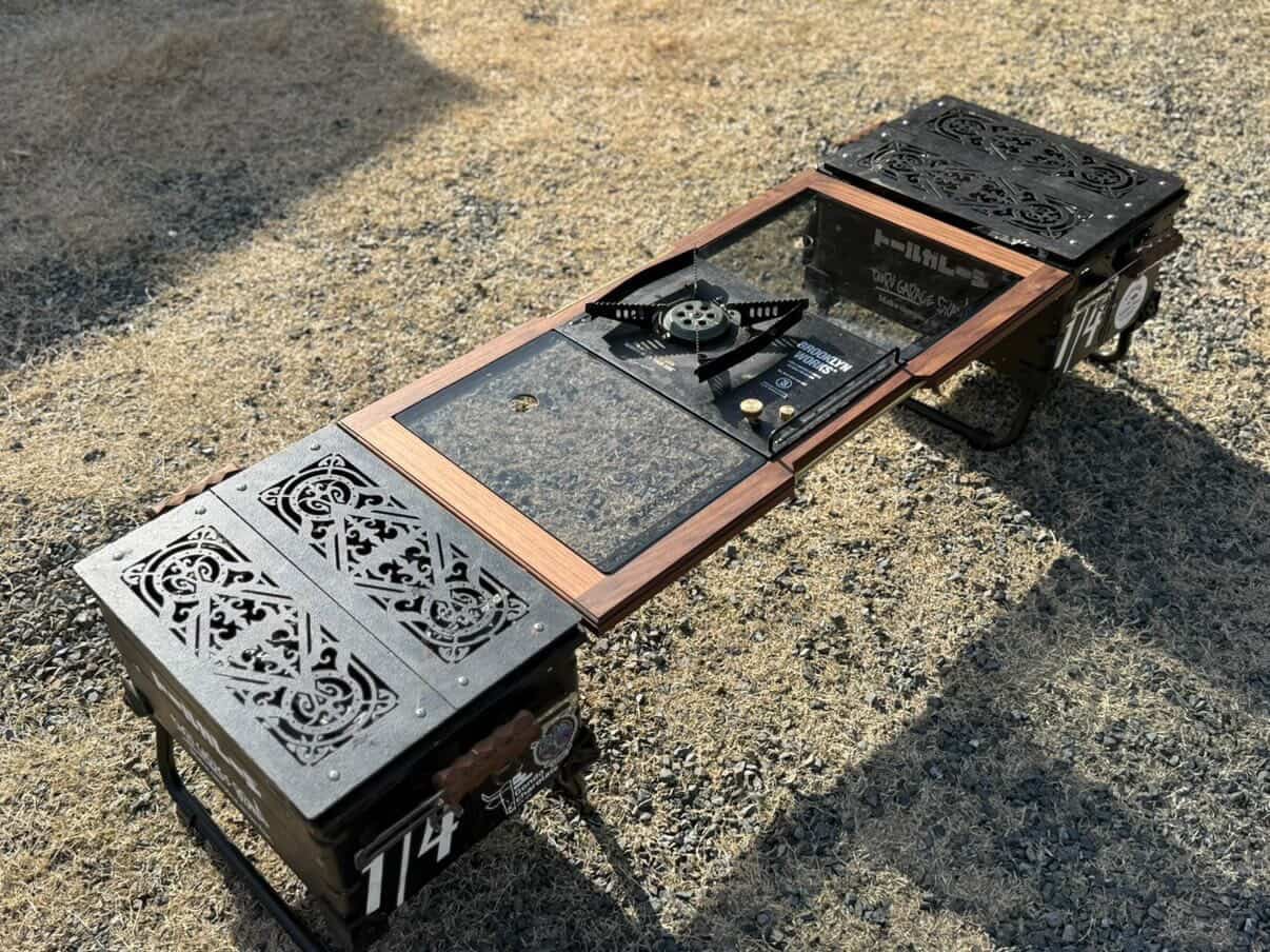 シェルコン2台を繋ぐだけで、キャンプサイトの中核を担う、堅牢かつ美しいメインテーブルが完成します。