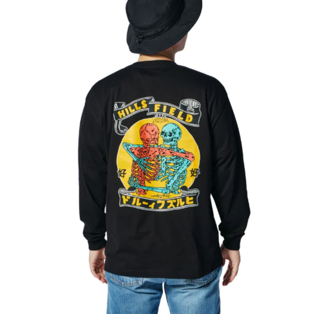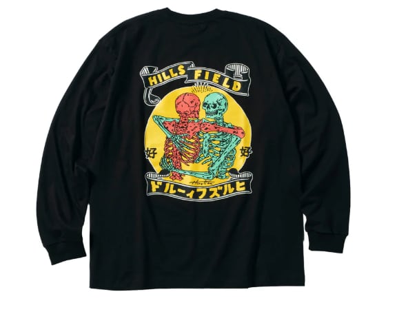 抱き合うドクロが印象的なバックプリントは、どこか懐かしさを感じさせるレトロ調デザイン。