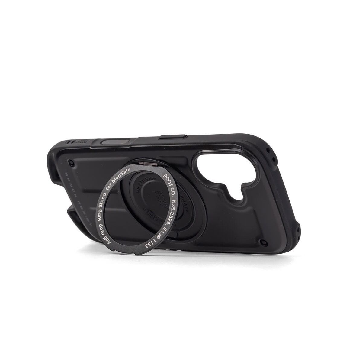 ケース背面にMagSafe対応モジュールを内蔵したリングスタンド を搭載。