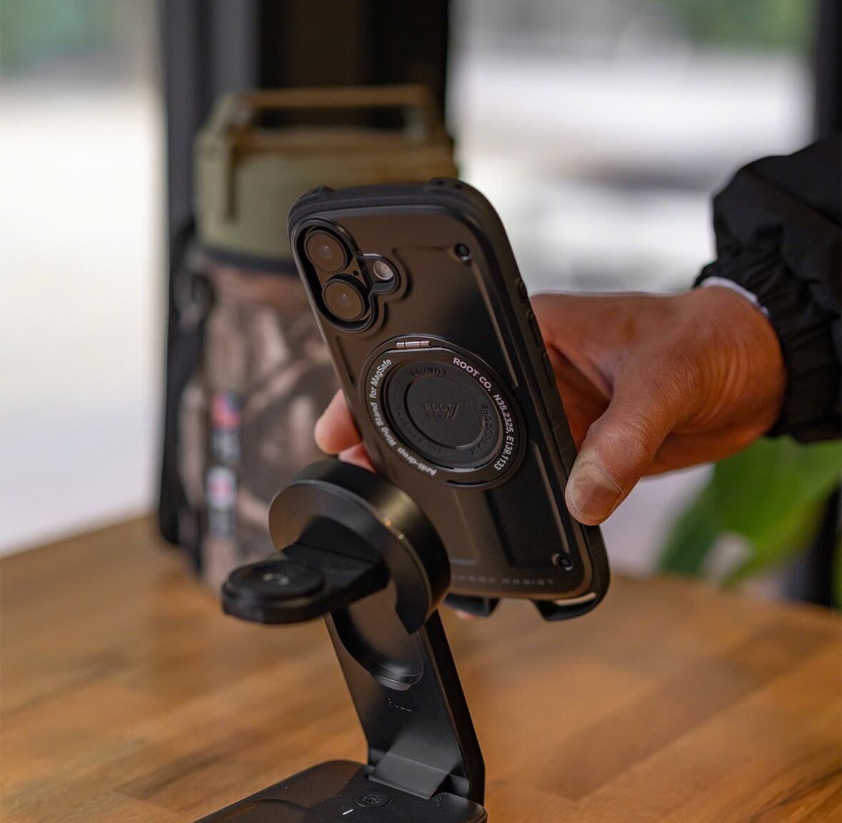 また、MagSafeモジュール内蔵リングスタンド部はアウトドアギ ア感あふれるアルミの質感が特徴。厚みわずか約4mmのスリム設 計。邪魔にならないデザインで、日常やアクティビティを最大限 にサポートします。