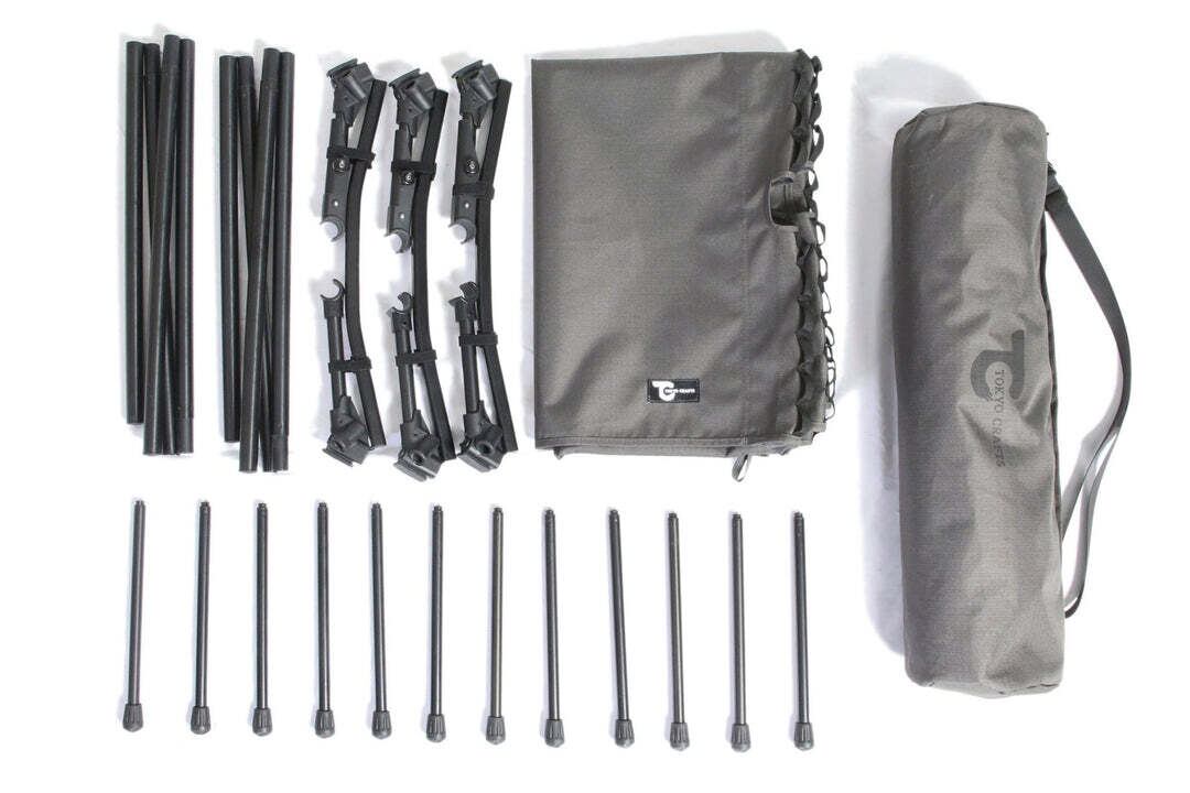 本体x1、メインフレームx2、レッグフレームx3、レッグポールx12、収納ケースx1、カラビナx2、ショルダーベルトx1、取扱説明書x1