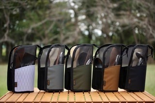 素材は、ボディ部分にXpacと中には自立するように芯材を入れ、それ以外の、上部・底面と極限まで細かいメッシュで虫や埃の侵入を防ぎ、水が溜まらないので、洗って濡れた状態で入れてどこかに吊下げておけば、乾くという機能的かつStylishなケースです。