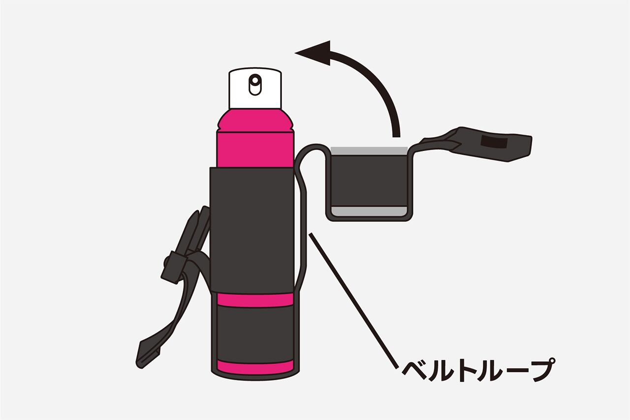 まずスプレーボトルのキャップをホルダー上部に入れ、ボトル全体をホルダーに収納します。キャップをホルダー上部に取り付けたまま、キャップを閉じてバックルで固定します。