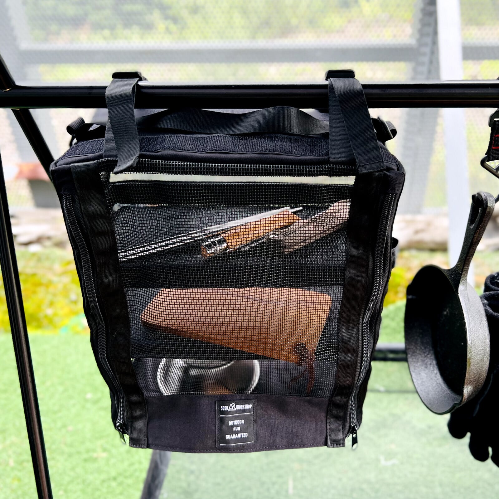 小型のキャンプ道具をコンパクトにひとまとめに収納する吊り下げ式収納棚、Hanging(吊り下げ)シェルフです。中の仕切りは全てベルクロで固定されているため、収納物に応じて1〜3室に可変できます。本体は潰して畳んでコンパクトになります。また、ベルクロとファスナーでしっかり閉められるフロントパネルのお陰で、揺れたり傾いたりしても収納したものがこぼれ落ちる事はありません。小物入れとして万能なアイテムです。