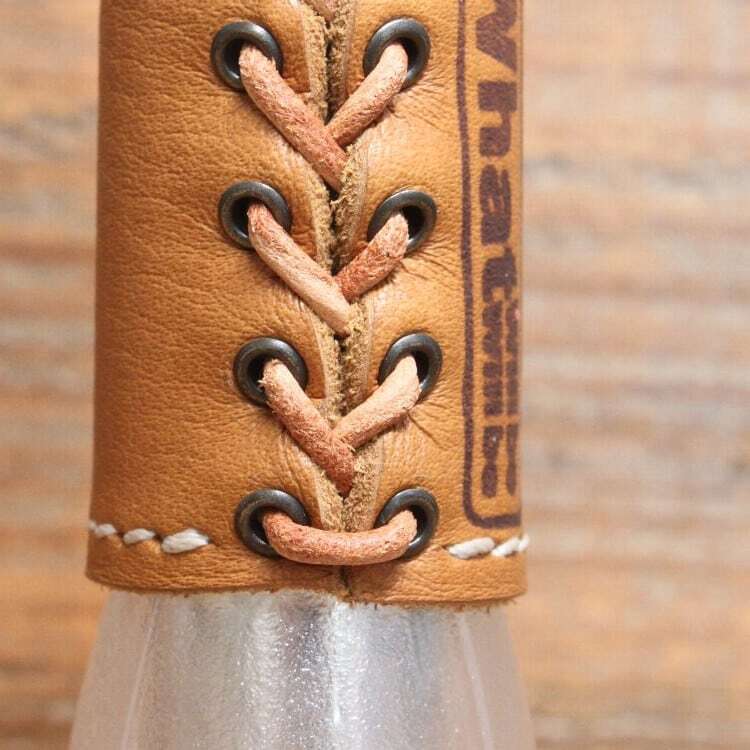 付属の革ひもは長めなので結び目をフックなどに引っ掛けられるようにしています。