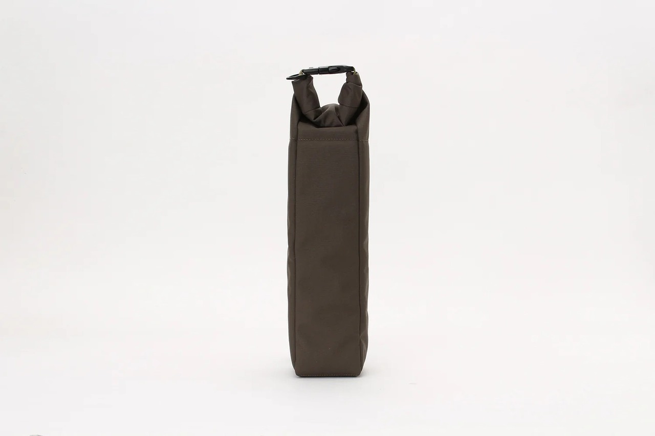旅先に日本酒やワインなどを運ぶのに適したバッグです。パッドが入っているのでガラスが割れにくく、また多少の保冷効果があります。ウェルダー加工とロールトップの採用で防水となっており、万が一ボトルが割れても漏れません。M サイズは一般的なワインボトルに適したサイズです。
