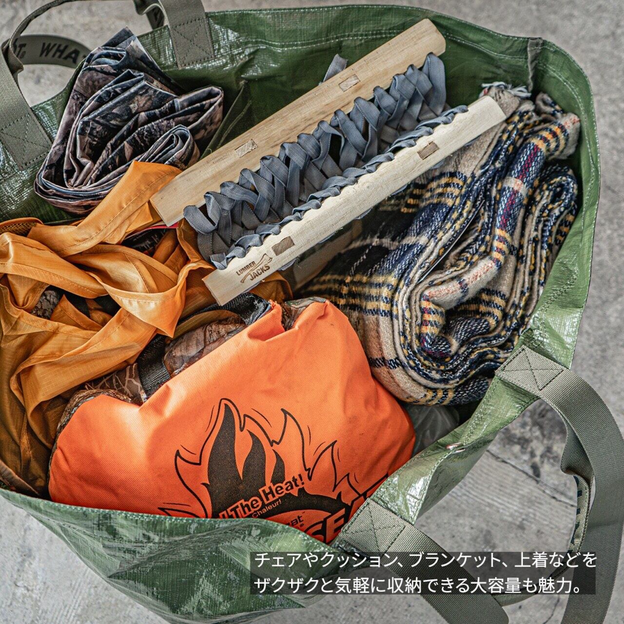 Lサイズは大容量設計で、チェアやブランケット、上着などもザクザク収納可能。